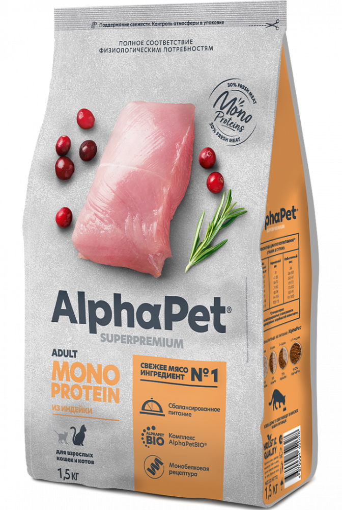 Описание AlphaPet Superpremium Monoprotein (АльфаПет) из индейки сухой для кошек 1,5кг: