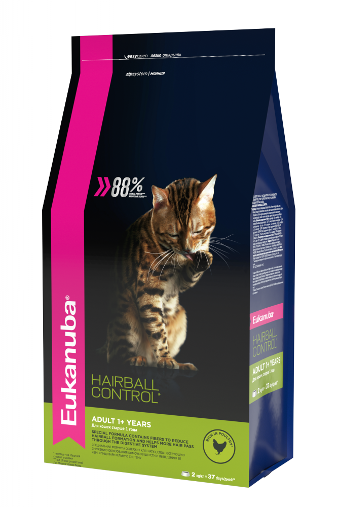 На 100% сбалансированный рацион, поддерживает здоровье кошки по шести ключевым признакам. Специальная формула корма Eukanuba Heirball Control для кошек содержит клетчатку, способствующую снижению образования комочков шерсти и выведению ее через пищеварительную систему. Владельцы кошек, живущих в помещении, часто сталкиваются с проблемами, которые возникают у кошек при нарушении естественного выведении комочков шерсти из организма.