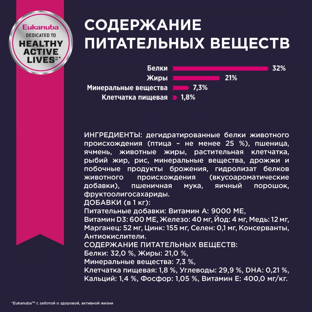 ИНГРЕДИЕНТЫ: дегидратированные белки животного происхождения (птица – не менее 25 %), пшеница, ячмень, животные жиры, растительная клетчатка, рыбий жир, рис, минеральные вещества, дрожжи и побочные продукты брожения, гидролизат белков животного происхождения (вкусоароматические добавки), пшеничная мука, яичный порошок, фруктоолигосахариды.