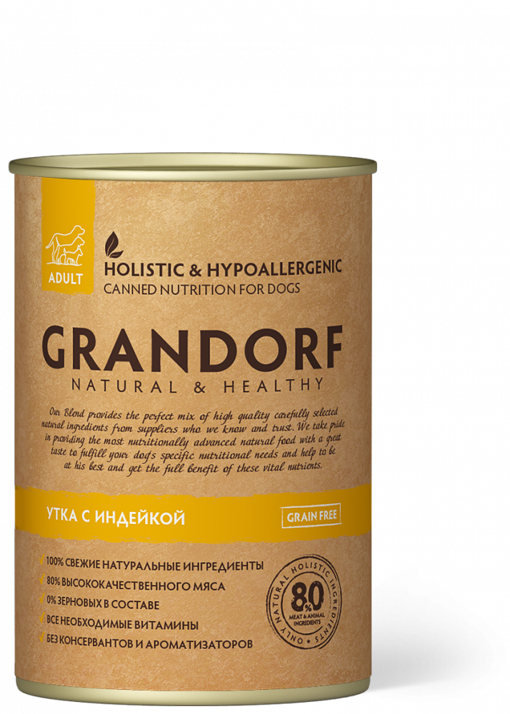 Натуральное беззерновое гипоаллергенное питание из мяса утки и индейки. Идеально для собак с чувствительным пищеварением или склонных к аллергии.