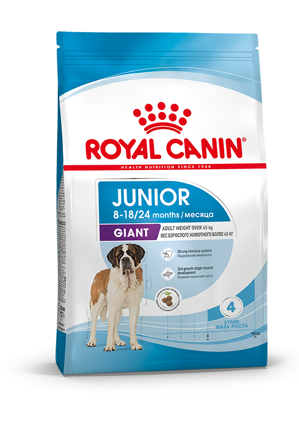 Формула продукта ROYAL CANIN® Giant Junior разработана с учетом потребностей щенков очень крупных пород (вес взрослой собаки больше 45 кг) и подходит для щенков в возрасте от 8 до 18/24 месяцев. Специально разработанный рацион содержит питательные вещества, необходимые щенку очень крупных размеров.
