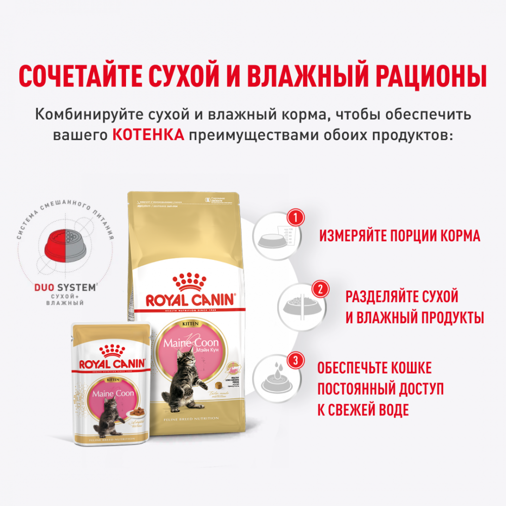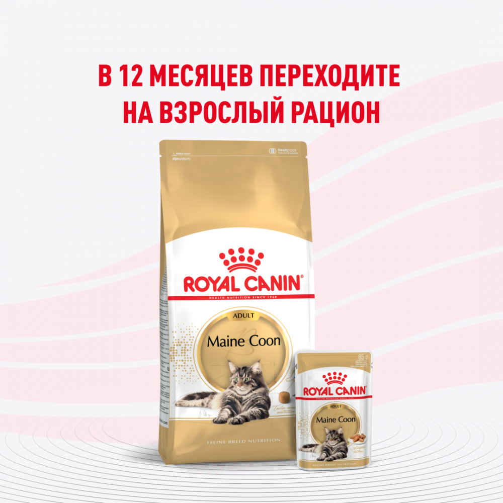 Для котят породы Мэйн Кун характерен исключительно длительный период роста, в течение которого формируется их необычайно крупное тело. Адаптированное содержание энергии и белков, а также баланс витаминов и минеральных веществ помогают поддерживать развитие костей и суставов для гармоничного роста.