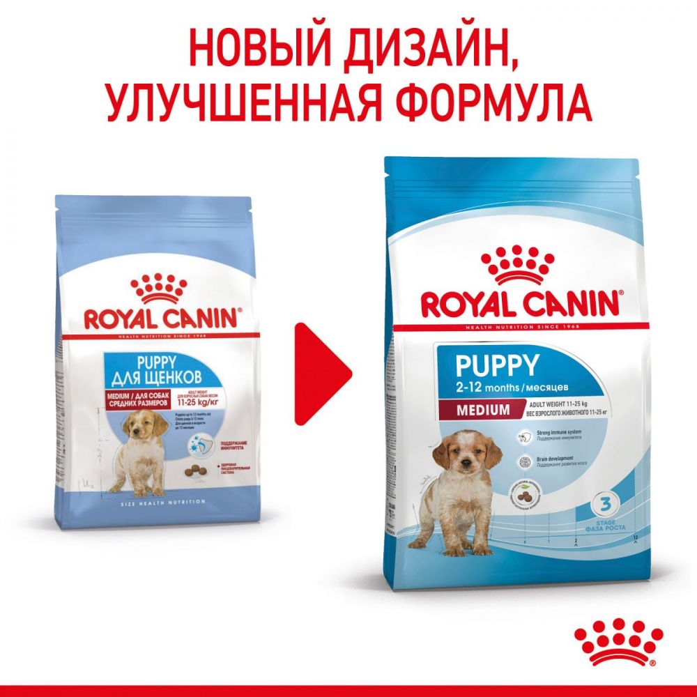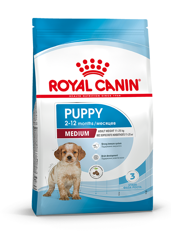 Формула продукта ROYAL CANIN® Medium Puppy разработана с учетом потребностей щенков средних пород (вес взрослой собаки 11-25 кг) и подходит для щенков в возрасте от 2 до 12 месяцев.