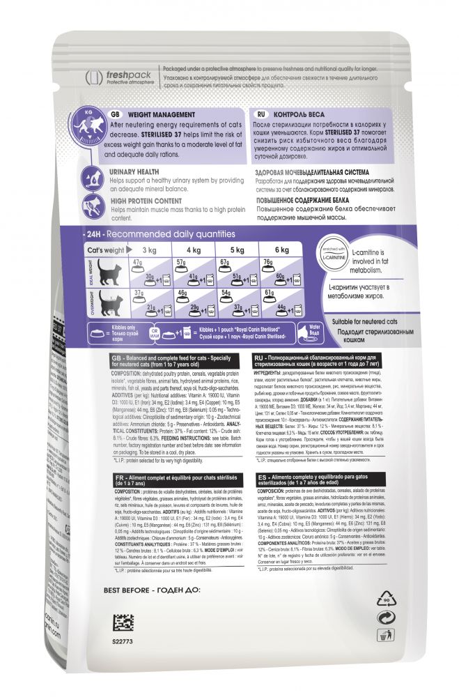 Для удовлетворения индивидуальных предпочтений каждого животного ROYAL CANIN® Sterilised 37 выпускается также в форме влажных продуктов: кусочков в соусе, в желе и в форме паштета. Если Вы используете смешанное питание, следуйте рекомендованным нормам кормления, чтобы сочетать сухой и влажный продукт в пропорциях, оптимальных для здоровья животного.