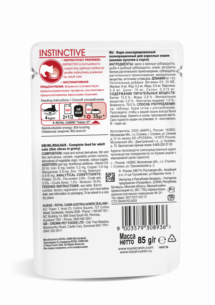 Инстинктив: влажный корм для взрослых кошек в возрасте от 1 года до 7 лет. Особый макронутриентный профиль продуктов Royal Canin обеспечивает их высочайшую вкусовую привлекательность для кошек на долгое время.